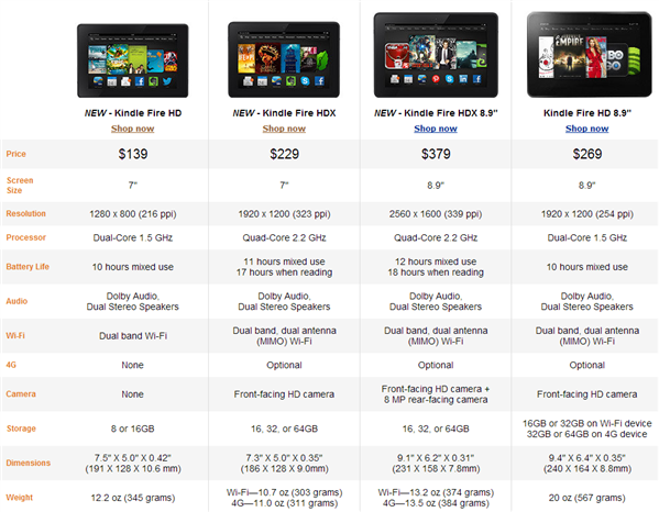 Viennent ainsi les Kindle Fire HD 7; Kindle Fire HDX 7″ et Kindle Fire HDX 8.9″.