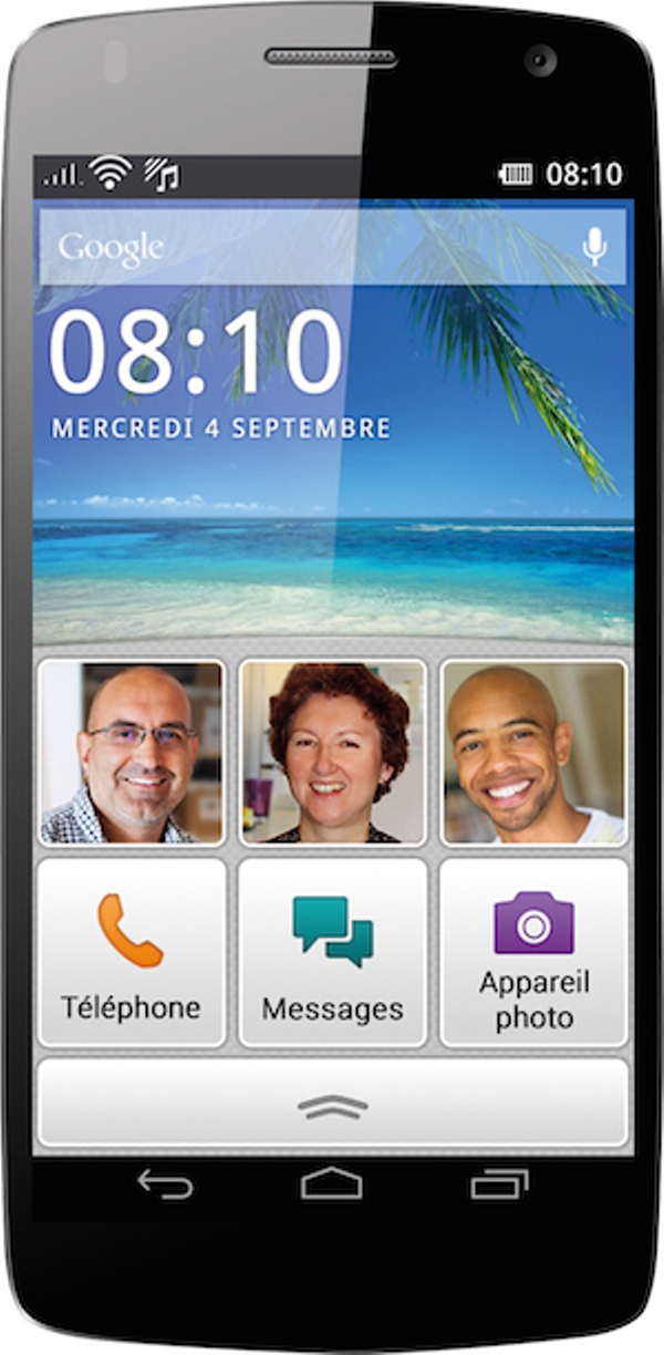 Ce dernier comporte de larges icônes permettant d’accéder directement aux fonctions désirées : téléphone, messages et appareil photo.