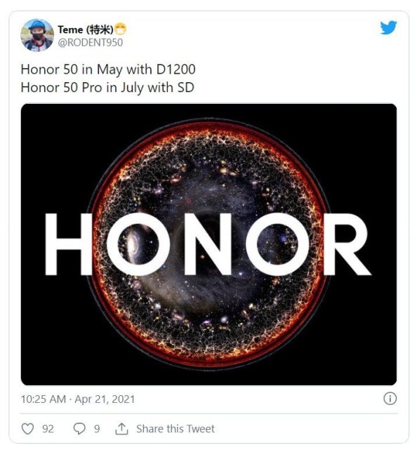 A côté de cela, un leaker asiatique du nom de Teme (@RODENT950) annonce dans un tweet datant du 21 avril 2021 que le HONOR 50 devrait être suivi en juillet par le HONOR 50 Pro.