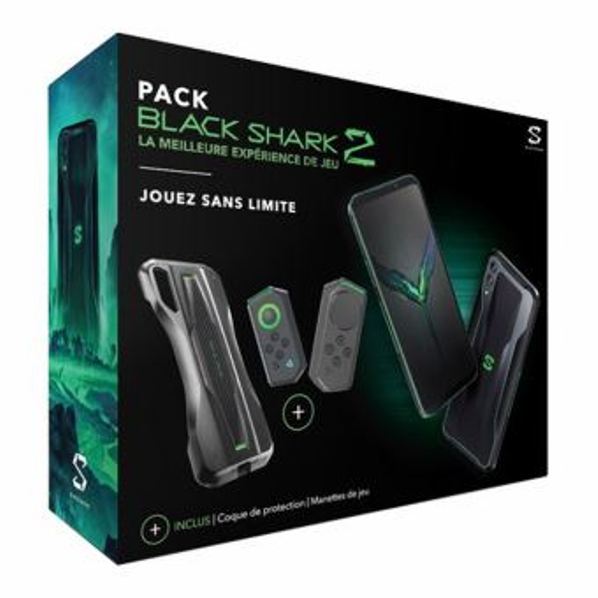 Le pack contient le Black Shark 2 double 8Go de RAM + 128Go de mémoire de stockage, une coque de protection et deux manettes de jeux.