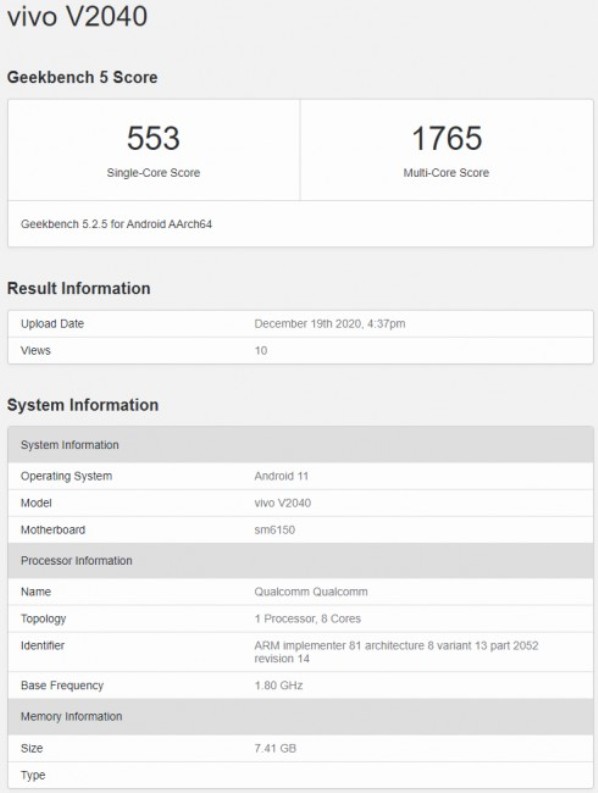 Un appareil de la marque chinoise Vivo portant la référence V2040 est récemment apparu dans un benchmark signé Geekbench.