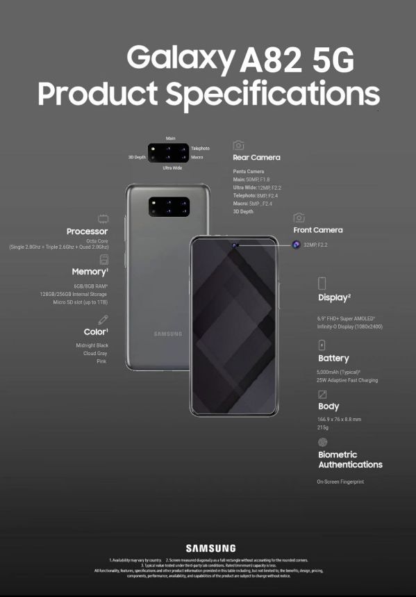 On apprend ainsi que le Galaxy A82 5G sera doté d’un écran FHD+ Super AMOLED Infinity-O de 6,9 pouces, d’un processeur 8 coeurs signé Qualcomm (probablement le Snapdragon 855+), de 6Go ou 8Go de RAM et de 128Go à 256Go de ROM.