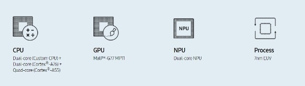Il est basé sur trois groupes de cœurs : 2 cœurs très haute performance développés par Samsung, 2 cœurs hautes performances ARM Cortex-A76 et 4 cœurs basse consommation Cortex-A55.