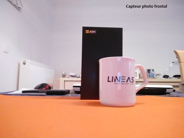 Si on retourne le mobile, on note la présence d’un capteur photo de forme circulaire, suivi d’un flash LED dual-tone, d’un lecteur d’empreintes digitales, d’un marquage AGM, et enfin de la mention « Designed by AGM ». Le tout est accompagné de quatre haut-parleurs.