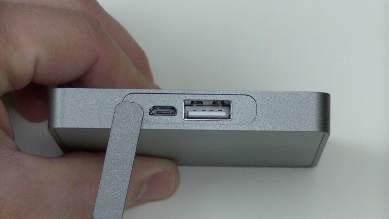 Pour ce qui est des connecteurs, on a bien évidemment l’incontournable (indispensable !) USB-output qui permet de recharger un appareil (smartphone, tablette…) et le micro-USB-input (tout aussi indispensable !) qui permet à la batterie d’être rechargée à son tour.