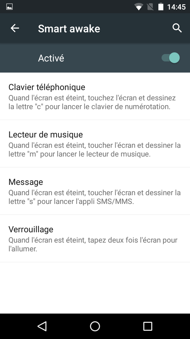 – La fonction Smart Awake qui permet d’activer certaines fonctions du téléphone (numérotation/musique/SMS) en dessinant une lettre sur l’écran de veille du smartphone.