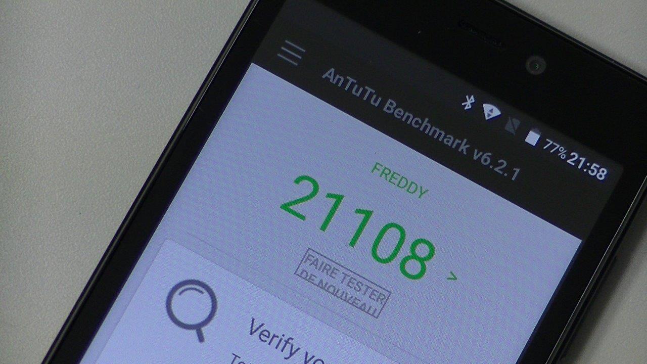 Loin de là, car il s’agit d’un téléphone aux composants entrée de gamme (comme en témoigne son processeur Snapdragon 210) et qui du coup ne permettent pas d’accrocher plus de 22.000 points sur Antutu.